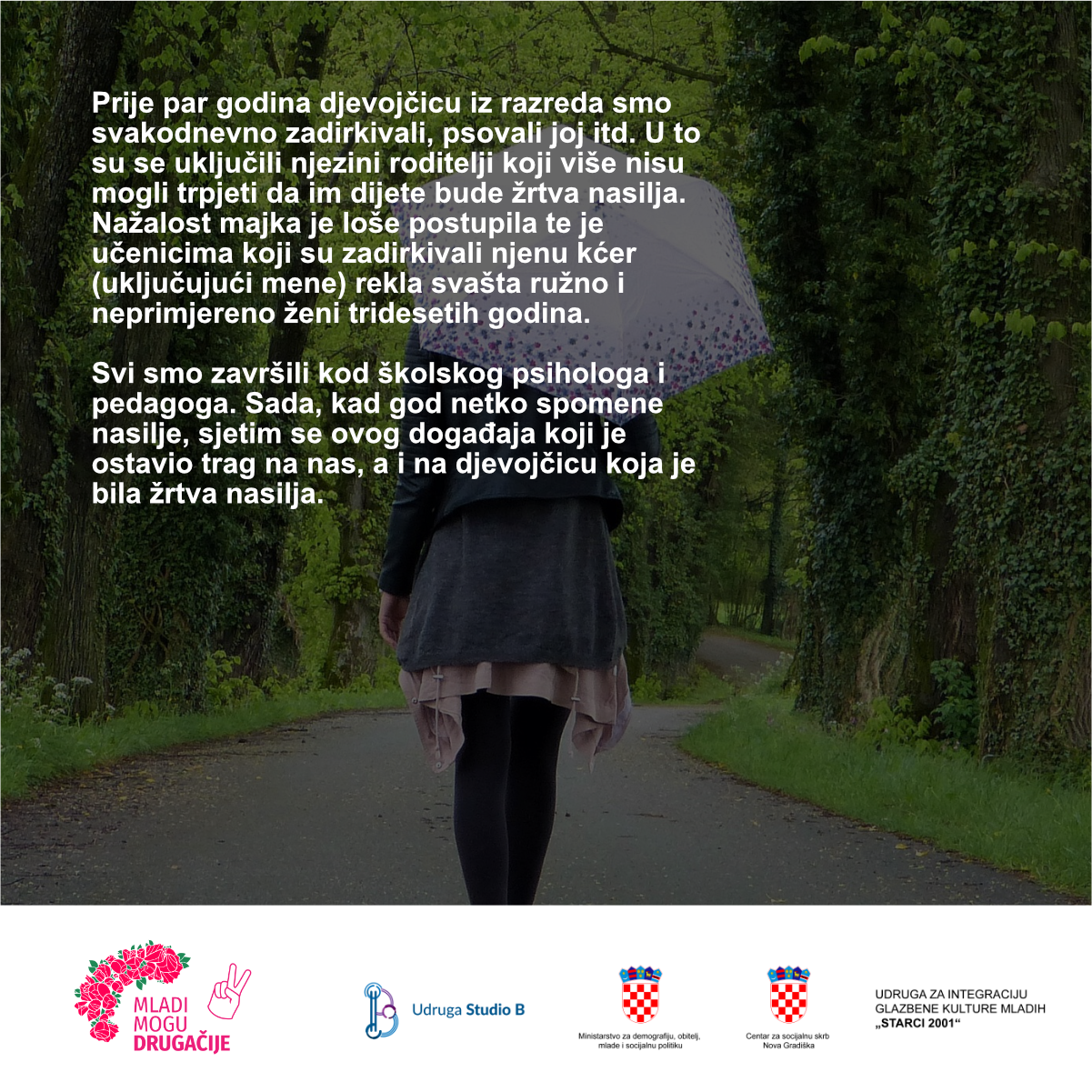 Kao posljednju aktivnost našeg projekta započeli smo provedbu društvene kampanje istoimenog naziva. Cilj ove kampanje je osvještavanje problema nasilja nad djecom i mladima na području naše županije, kao i razbijanje predrasuda i povećanje tolerancije među članovima zajednice. Sve materijale pripremili su sami mladi kako bi svojim vršnjacima ukazali na problem međuvršnjačkog nasilja i poručili kako ono nikad nije rješenje.
